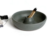 Each handmade ceramic palo santo burning bowl has a holder for the palo santo stick in the center of the bowl to hold it in place securely.