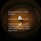 Light up your space with the soft, effortless warmth of our handcrafted coconut-wax candles. Each candle is poured in small batches in our Laguna Hills studio using our signature coconut wax and a natural crackling wood wick that instantly creates a soft, fireside glow. Housed in a timeless amber glass jar, this candle elevates any space while offering up to 50 hours of clean, phthalate-free burn time.