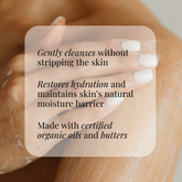 Formulated with organic Coconut, Olive Fruit, and Sunflower Seed Oils to restore moisture and support the skin’s natural barrier, and enriched with organic Shea Butter and Aloe Leaf Juice for a smooth, soothing cleanse that never feels drying. The result is skin that feels refreshed, supple, and delicately cared for with every wash.